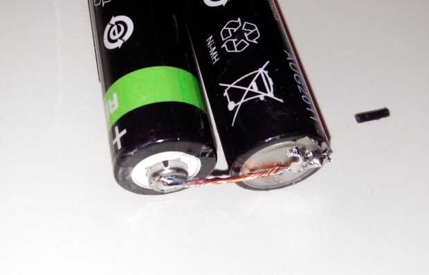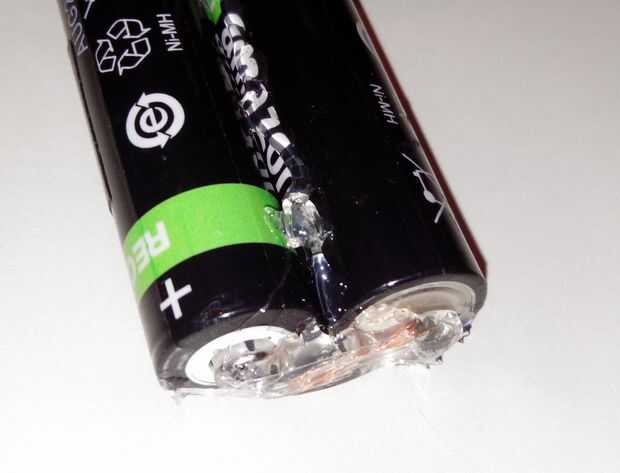 Soldar un pequeño cable a los terminales positivo y negativo de las baterías recargables para conectarlos en serie (1.2V + 1.2V = 2.4V).