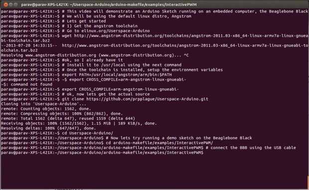 Casi todos en la comunidad incrustada están familiarizado con el entorno de desarrollo Arduino. Creación de las bibliotecas de Arduino para espacio de usuario podría ofrecer una reducción significativa en el tiempo de desarrollo de proyectos en el Beaglebone que implican interfaces con periféricos externos, con la ventaja de ejecutar otros espacio de usuario aplicaciones lado a lado.