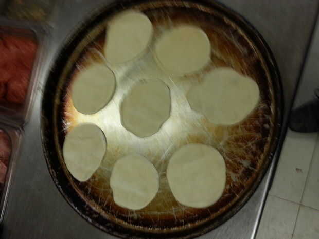 tomó una masa de pizza y utiliza un cilindro para cortar círculos, llevó a los círculos en una bandeja plana y aplanado hacia fuera