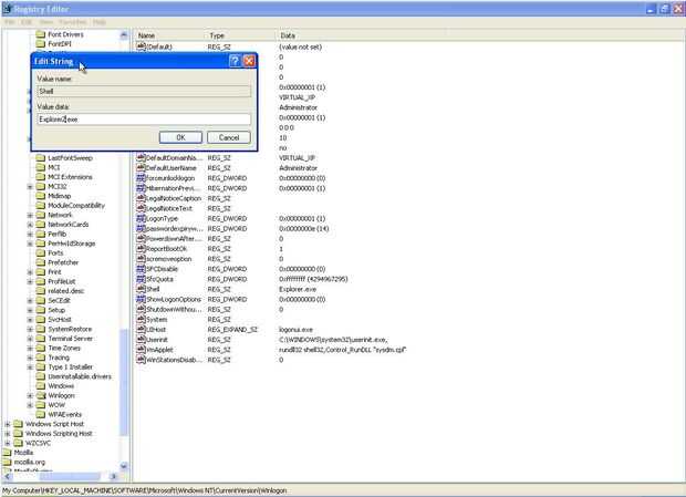 Ahora vamos a navegar a "HKEY_LOCAL_MACHIENE\SOFTWARE\Microsoft\Windows NT\CurrentVersion\Winlogon. Modificar la entrada "Shell" para "explorer2.exe".