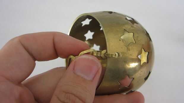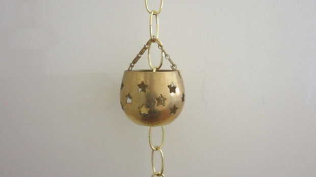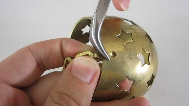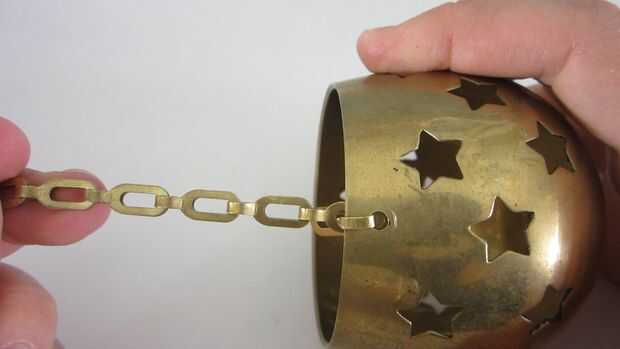 Comience conectando un extremo de la cadena de plomero a uno de los agujeros en la parte superior de una taza. Luego lazo cadena de plomero a través de uno de los eslabones de la cadena más grande. Luego enganche el otro extremo de la cadena de plomero a otro orificio en la taza. Fijar la cadena a la Copa por pellizcos con un par de pinzas que sostiene firmemente al lado de la taza.