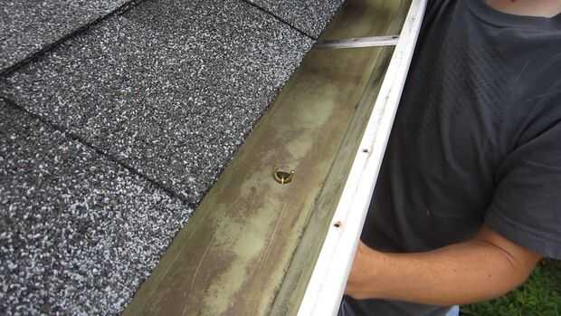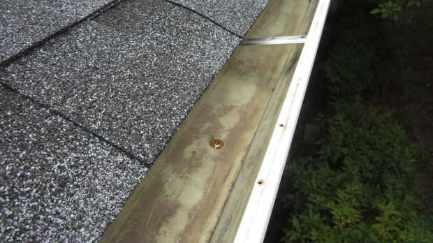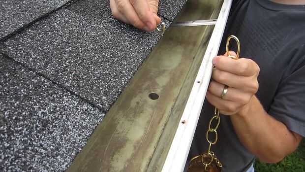 Tomé un eslabón de la cadena y cortar por la mitad con cortador de perno. Luego llevó a cabo el enlace superior de las cadenas de la lluvia hasta inferior del lado del agujero en la cuneta. Luego en la parte superior del canal, tuvo el enlace cortado y había enrollado a través del enlace superior de la cadena de lluvia. Porque el enlace es más ancho que el agujero en la cuneta fue capaz de sostener el peso de la cadena sin ser tirado a través del orificio.