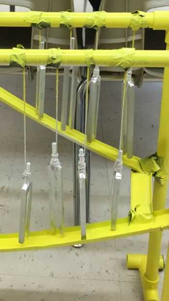 Los diapasones son la clave para la escultura. Ellos le dan su efecto musical y la mayor parte de la pieza. Nosotros atamos con cuerdas para que sean capaces de influir y mover fuera del camino del mármol, pero también fácilmente podríamos dictar su longitud al armazón. Fijar la horquilla a la estructura mediante un trozo de cuerda y asegurarse de que es la correcta altura de la rampa para que sea capaz de pasar por un mármol todavía golpean pero no obstruir su camino. Usamos 4 en cada rampa pero cualquier número puede ser utilizado dependiendo del tamaño del marco y cualquier que gusto es aceptable también.