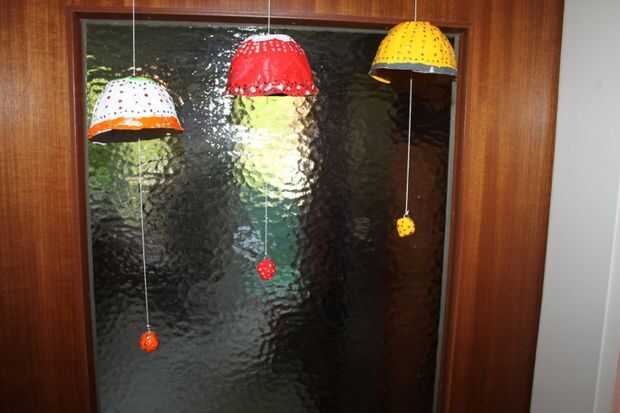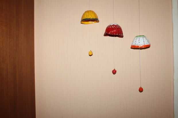 Asegúrese de mostrar la distancia entre las campanas son las mismas. Puede colgar sobre un palo de madera dándoles diferentes alturas y mostrarlas en cualquier lugar. Yo les he colgado en la puerta.
