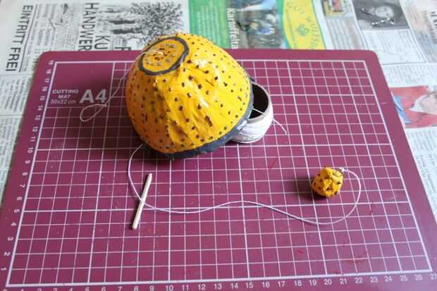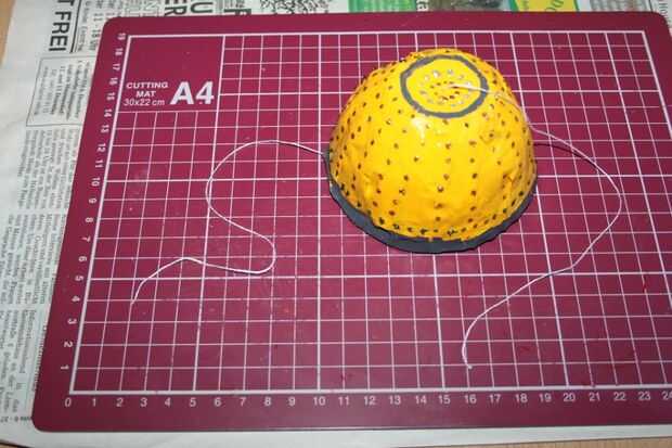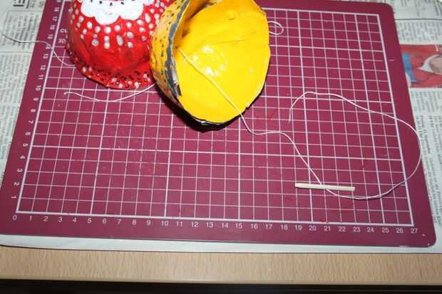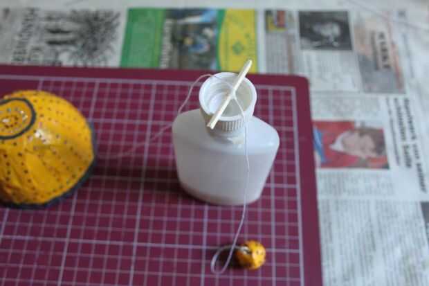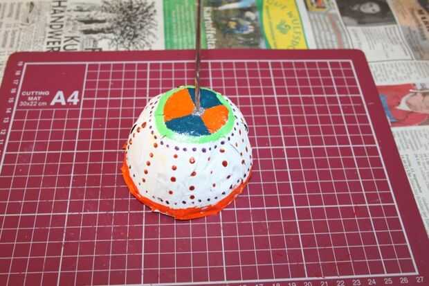 Pinchar el molde en el centro y pase el hilo de crochet blanco por. Mantenga la longitud de la rosca como usted quiere. Amarre el palo de fósforo (o incluso un pequeño palo de madera) en el hilo y aplique un poco de pegamento blanco para que no se mueva. El palillo de fósforo contiene el hilo bajo la Copa. El espacio entre el palo de fósforo y la bola es de alrededor de 8-9 pulgadas. Atar el extremo del hilo inferior del gancho.