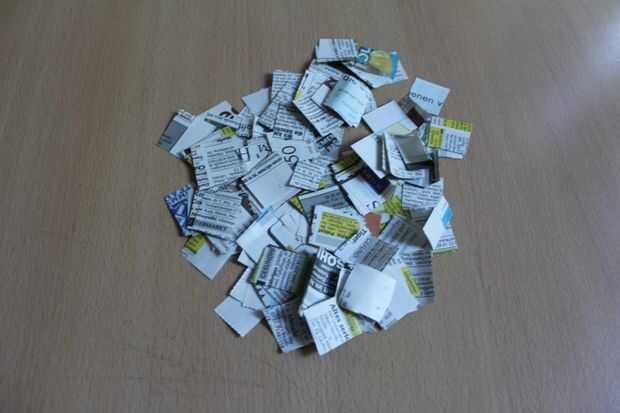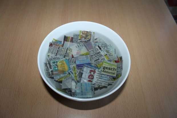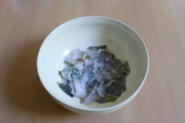 Ahora rasgar el periódico en cuadrados pequeños de 2,5 cm. Remoje en agua durante 3 a 4 horas. Luego squeez el agua de remojo en pegamento blanco diluido, durante 30 minutos los cuadrados de papel de noticias. Squeez el blanco del pegamento del papel empapado y hacer pequeñas bolas de unos 3 cm de diámetro.
