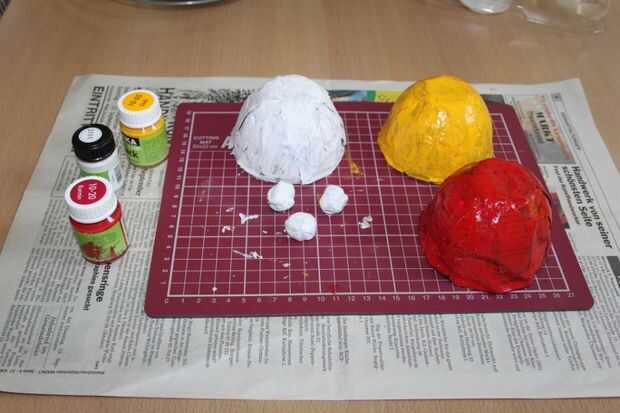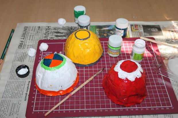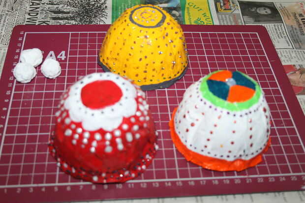 Pintar los moldes. Usé acrílico brillante para los moldes rojos y amarillos. Cuando es brillante es difícil dibujar un diseño con un lápiz. Así que si desea dibujar en él uso Matt acabado acrílico. La segunda capa se tiene que hacer cuando esté seco. Pintura interior, como cuando cuelga se aprecia. Decorar con colores. Utilicé colores brillo 3D y pintura de tela para los puntos. Una vez que se seque totalmente hacer una capa de barniz brillante.
