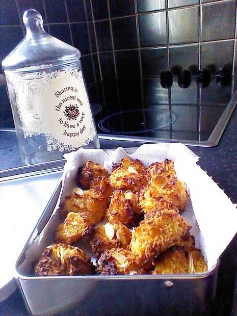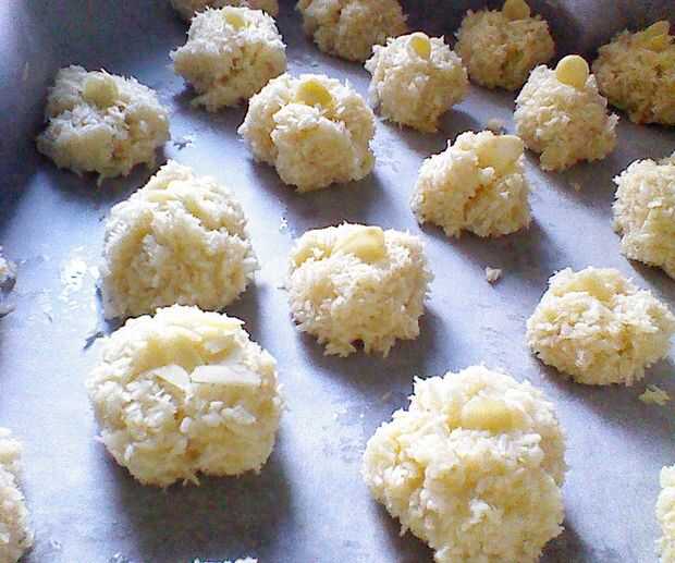 Mezcla a, b, c junto. Hacer formas de bola con la mano y colocarlos en un recipiente no-pegajoso. Inserte un par de hojuelas de almendra encima de cada bola. Cocinar en horno precalentado a 200degrees durante 10 o 15 minutos. Eso es todo! ^__^