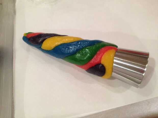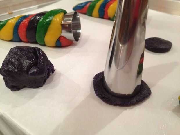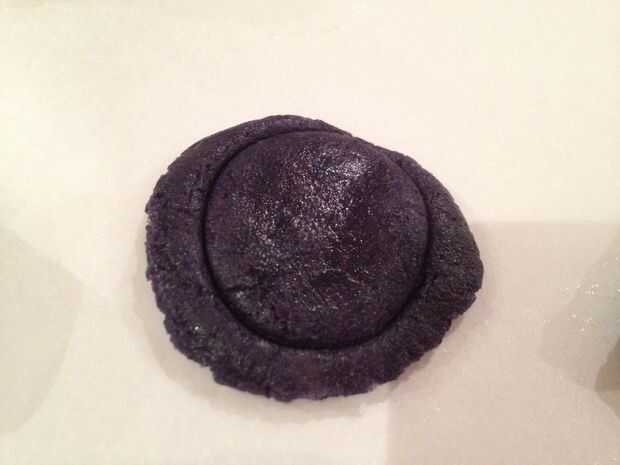 Luego tome una de las formas de cuerno de crema que no utilizas, cortar un círculo de masa. Esto se verá como un pequeño, redondo, galleta... Pero de hecho, va a ser la tapa! Para el extremo abierto de la bocina, más adelante.