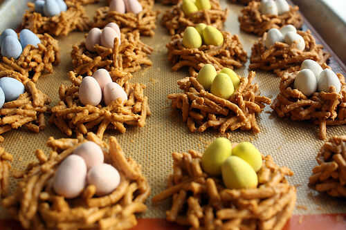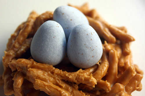 Nota: Si la mezcla de la galleta se vuelve demasiado seca y no pega (esto puede suceder dependiendo de la marca de caramelo bocados que utilizas), puede agregar más bocados de caramelo derretidos a la mezcla. Si han configurado las galletas antes de que haya podido colocar los caramelos en forma de huevo, puede sumergir la parte inferior de huevos con caramelo derretido antes de colocarlos en el centro de cada galleta.