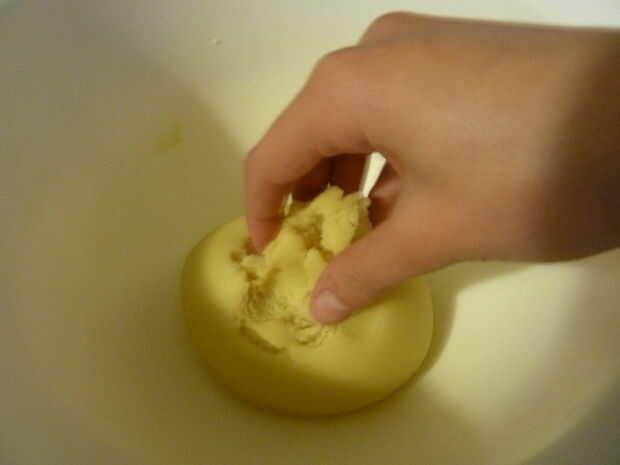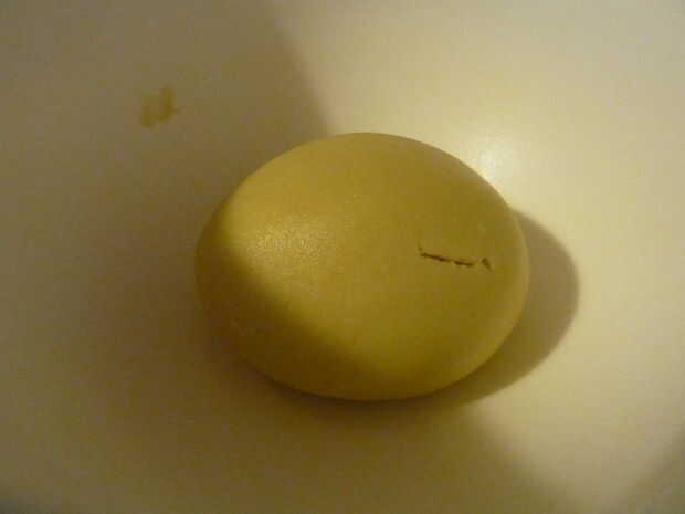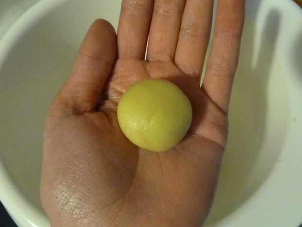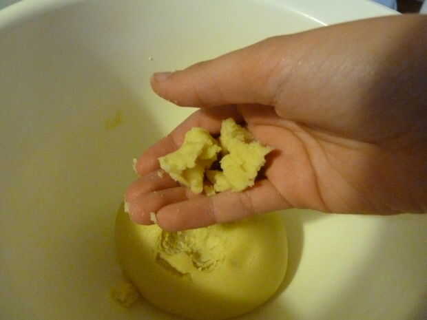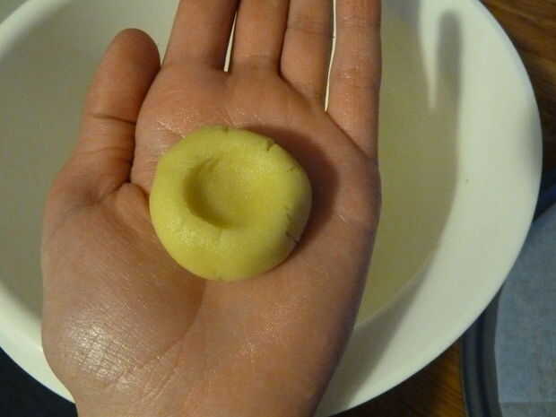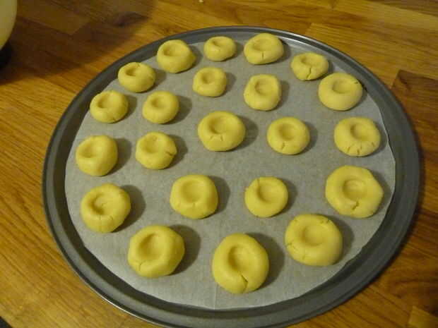 Tomar pequeños trozos de la masa y hacerlas rodar en bolas. Antes de añadirlos a la bandeja para hornear, presione el pulgar de para que la parte de la huella digital. Asegúrese de no poner demasiado cerca entre sí, de lo contrario se pegan al ser cocido al horno.
