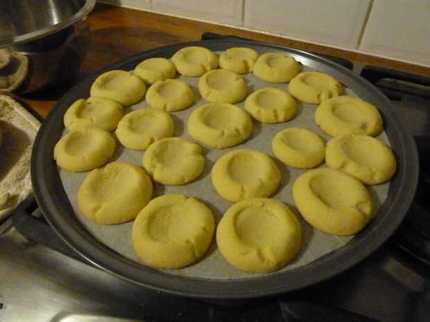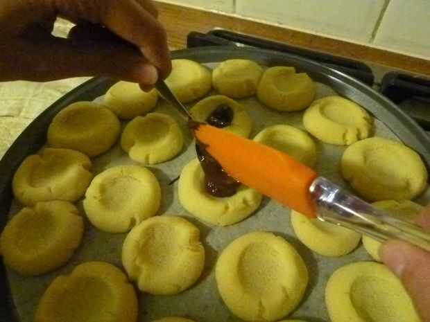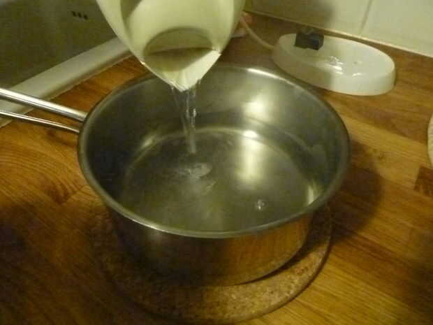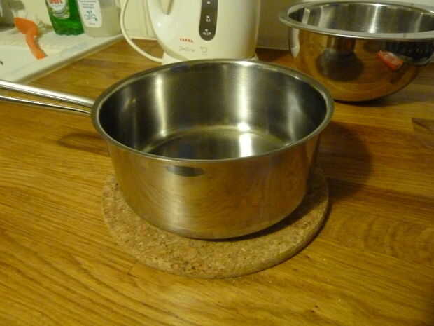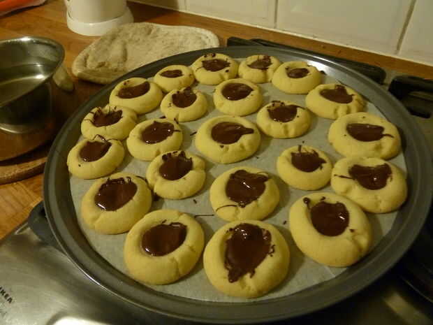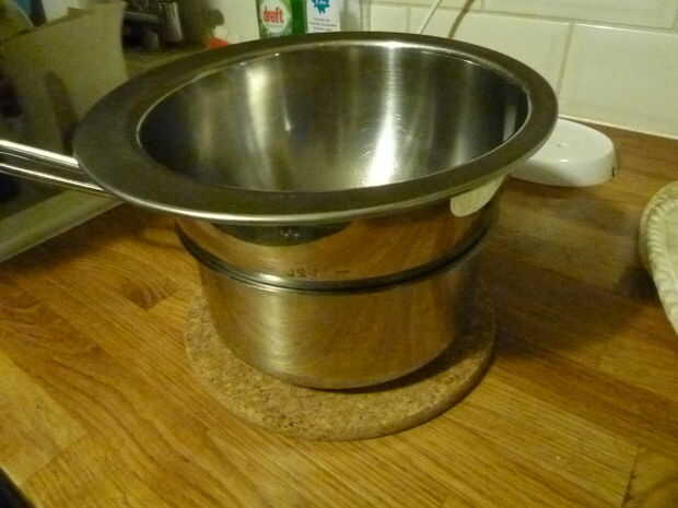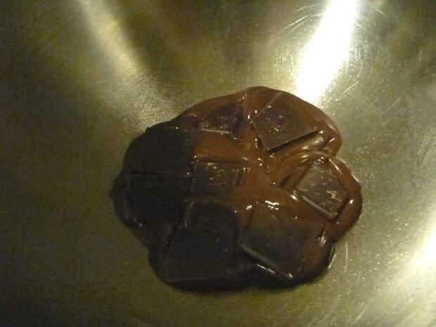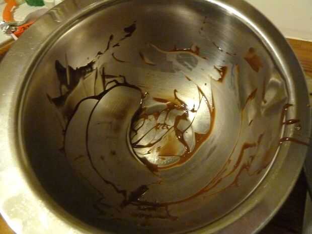 A continuación hervir agua y añadir a la sartén. Colocar el vaso en el agua y añadir el chocolate pieza por pieza. Cuando el chocolate se ha fundido, use una cuchara para agregar a las galletas y una espátula para sacarlo de la cuchara.