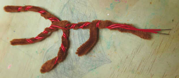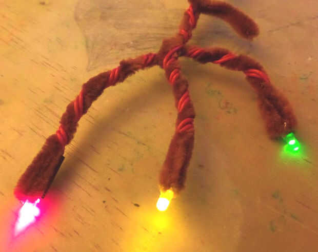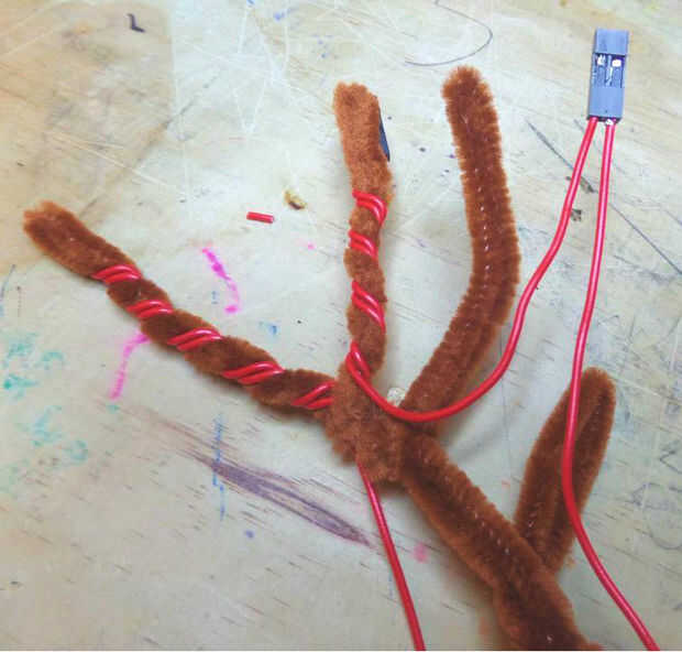 A partir de la más alta rama de cornamenta, pele los extremos de dos de los cables de la encrespadura en los pernos (una vez más, ver LED'tenna estos detalles) y empuje los pines de los conectores. Este viento abajo de la longitud de la rama en el tallo principal.