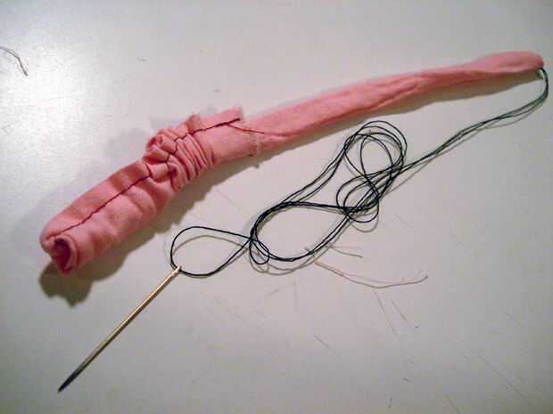 Ahora, tire suavemente el tubo de la tela de adentro hacia fuera, usando el hilo de la aguja para tirar a través. Debe resultar muy fácil.