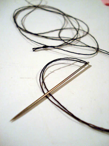 Gancho para arriba con un hilo, resistente si tenerlo y doble lo nudo como se muestra. (Si trabajas con una tela gruesa, puede incluso ejecutar un segundo hilo de rosca a través de él en caso de que se rompe).