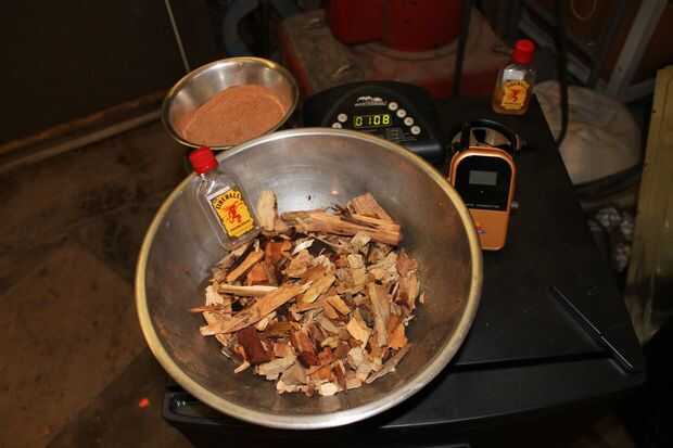remojar virutas de madera o madera de la opción en whisky de bola de fuego + agua de mezcla. una hora antes de fumar fumador a 225-230 y ajuste las costillas hacia fuera de precalentamiento para calentar un poco cool temp. aplicar rub si no hecho antes de este tiempo. no es necesario hacerlo un día antes pero sabor es mejor si se hace el día antes. Si utilizas agua en fumador (preferencia personal) llenado agua pan 1/2 lleno con agua y ad unos tragos de whisky canela