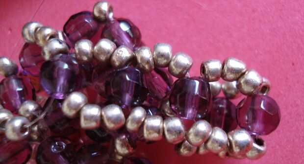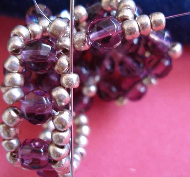 1. mirando diseño de anillo, trozos puntiagudos en la parte superior e inferior, llevando a cabo poco más verticalmente. Pasar una hebra de cuerda de nylon en 2 agujas y luego hilo de derecha de semillas de bolas (2 semillas de granos deben ser visibles saliente de 2 bolas checas a la derecha.