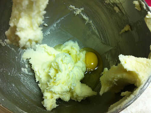 Añadir el huevo y batir más. La masa generalmente obtiene pegajosa y esponjosa entonces otra vez cuando se agrega el huevo.
