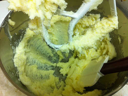 Beat 1 C de la mantequilla hasta que esté esponjosa y liviana de color. Añadir el azúcar y seguir batiendo. Los gránulos de azúcar cortan bolsas de aire en la mantequilla, que ayuda a hacer una buena estructura para el cookie y a incorporar los demás ingredientes uniformemente.