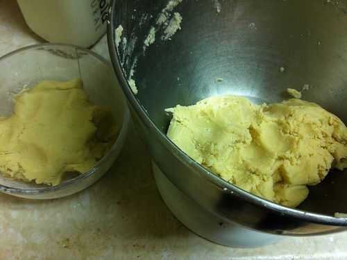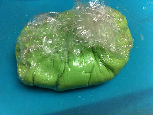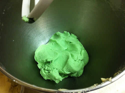 Añadir unas gotas de colorante verde, el extracto de menta y el azúcar a una porción y mezclar bien. Me esta había desordenado y agregar el azúcar en polvo a toda la masa. No lo hace. Desea añadir azúcar extra a la parte no cacao porque las dos masas deben ser sobre la misma textura al crudo. Cacao en polvo endurece la pasta de cacao, para agregar en polvo azúcar sobre la masa verde ayuda un poco.