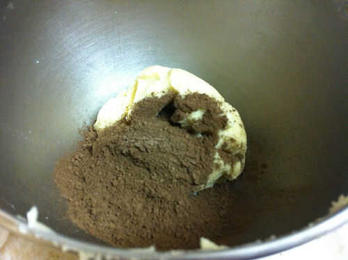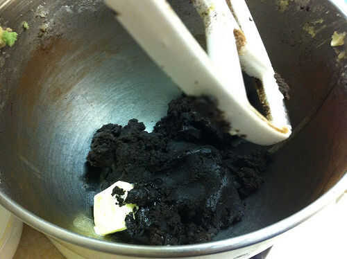 Suavizar (o caramba, fundir) los 2 Reservados T mantequilla y mezcle con la otra porción de masa, junto con el polvo de cacao 1/2 C. La mantequilla ayuda a suavizar esta mitad de la masa para que coincida con la suavidad de la masa verde.
