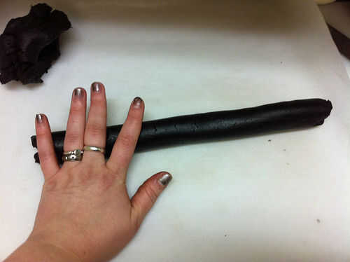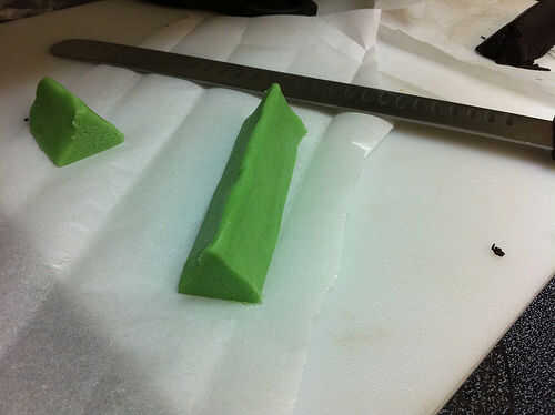 Una vez se ve la forma que desee, rebanar el registro en tres secciones. Ahora tire un trozo de masa verde, usando aproximadamente 1/3 como mucho como la masa de cacao. Este rodillo en un tronco triangular, asegurándose de que es del mismo tamaño que los registros de cacao.