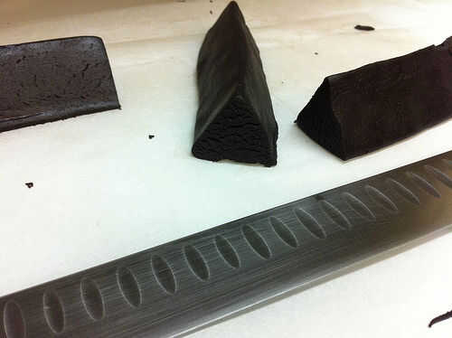 Tire una buena parte de la masa de cacao. Aquí utilicé la mitad la masa de cacao. Rodillo en un registro en papel de pergamino. Dobla el papel pergamino en el registro, luego presione suavemente un largo cuchillo contra un lado, presionar al otro lado de la masa con la mano. Cuidadosamente forma la masa en un tronco triangular de esta manera.