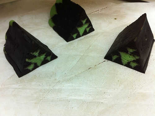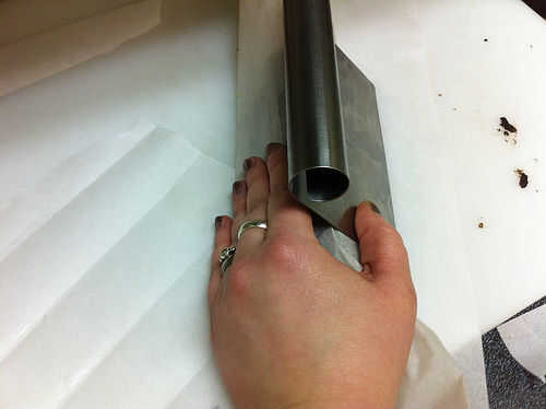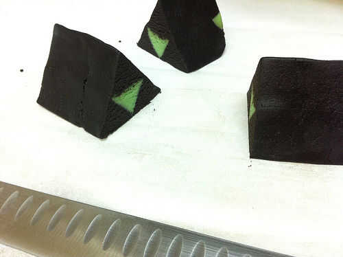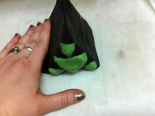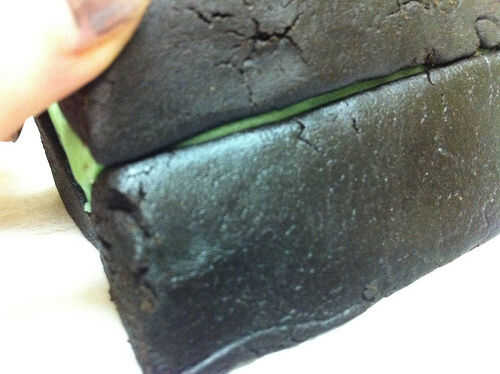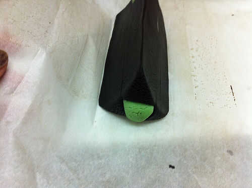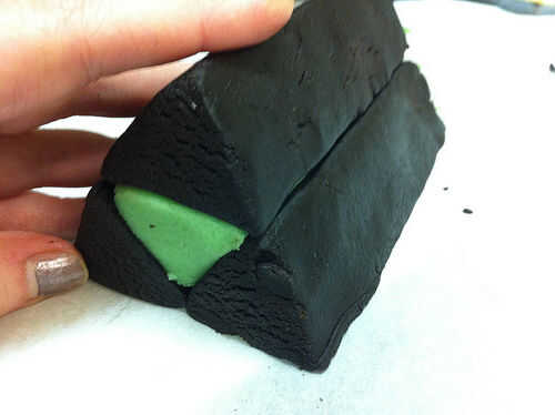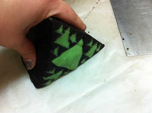 Asegúrese de no meter la masa verde de los lados del tronco, o conseguir distorsionará los triángulos. Esto es cuando se convierte en importante para las dos masas tener la misma consistencia. Presione los lados del tronco, manteniéndolos rectos, pero lo alargando. Ayuda a envolver el registro en pergamino y use un raspador de navaja o masa plano.