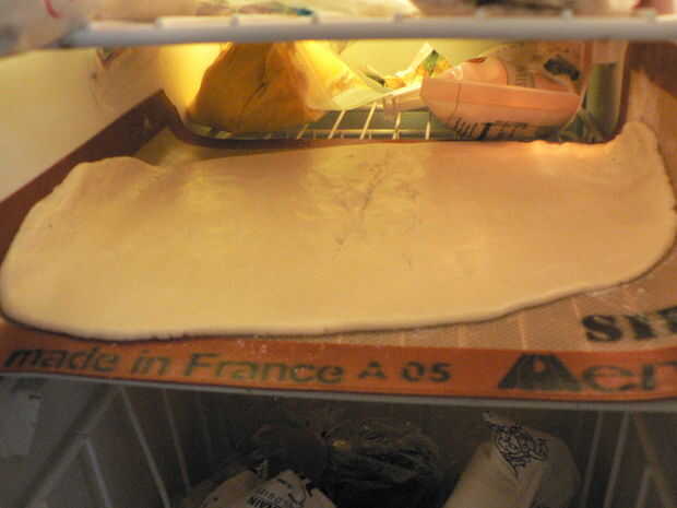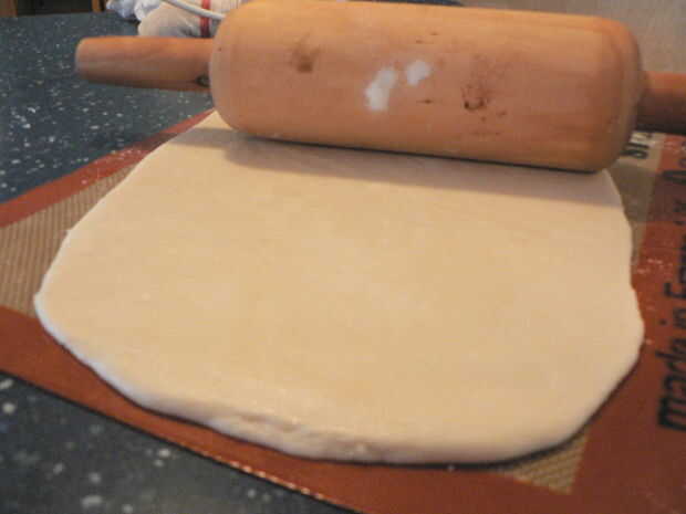 a continuación, sacar la bola blanca lisa de masa sobre la superficie de trabajo que ha sido ligeramente espolvoreada en azúcar en polvo (utilicé mi fiel silpat). Estirar hasta que quede 1/4 pulgada de espesor. Coloque en el congelador durante 10 minutos.