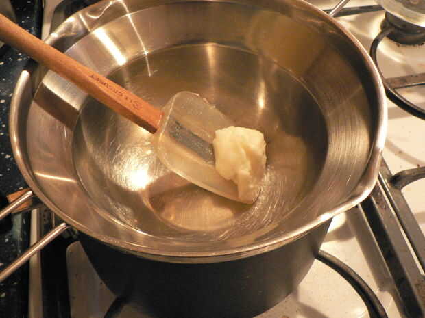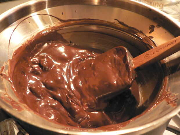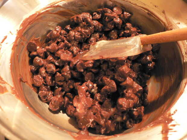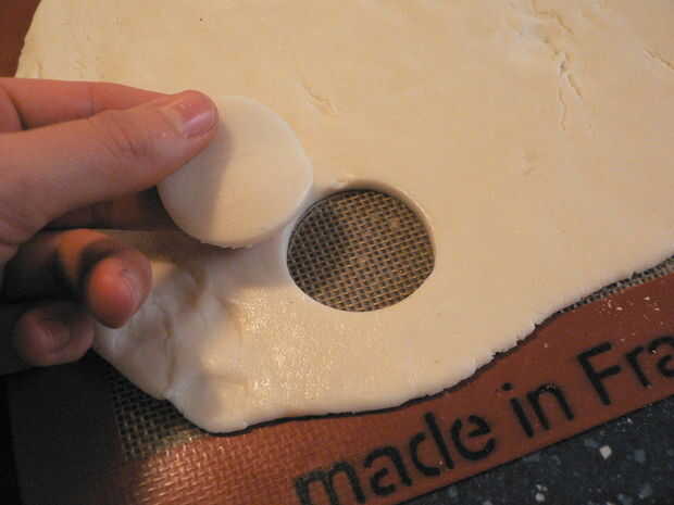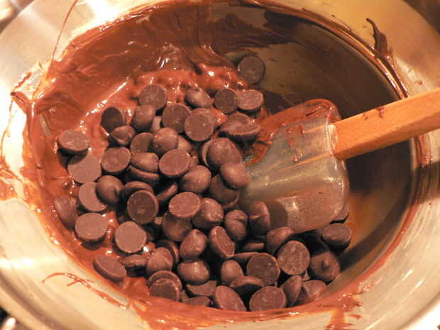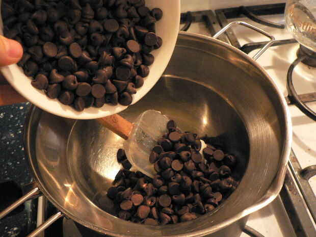 Usar su cortador de galletas (o vaso) perfora círculos en la masa y vuelva a colocar en el congelador por 10 minutos. Mientras están en el congelador, a empezar a derretir el chocolate. Si está usando una caldera doble, configurarlo y poner los trocitos de chocolate y la manteca en la parte superior y comenzar la fusión. Si está usando un microondas, poner los ingredientes en un recipiente resistente al calor y comenzar la fusión, calefacción intervalos de 30 segundos en alta y en el medio revolviendo hasta que esté suave y sin grumos.