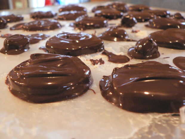 La variación 'Junior Mints', simplemente recoger el impar en forma de trozos y tiras de masa sobrante del corte del círculo procesan y rodarlos en bolitas, aplanar ligeramente en dos lados a la forma tradicional junior menta. Les pop en el congelador durante unos 5 minutos a la firma y entonces les sumerja en la misma forma que las mentas de la circular. Enfriar hasta que cuaje.