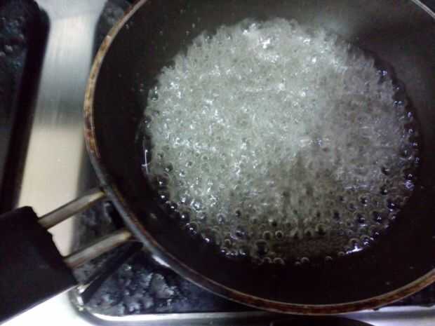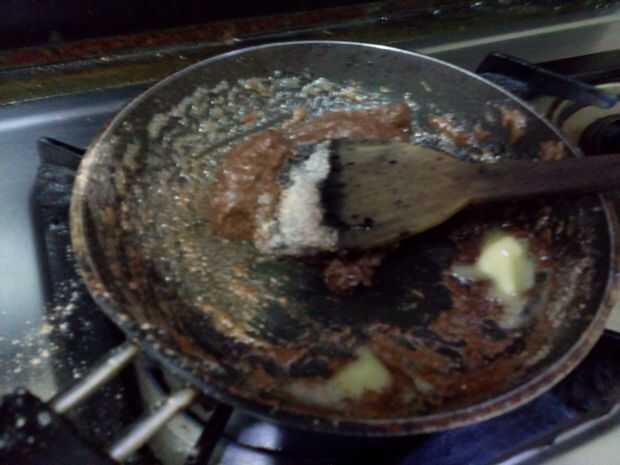 Deje que el jarabe hierva hasta que el jarabe alcanza consistencia única cadena... al tomar el almíbar entre los dedos deben formar una delgada cuerda como se muestra que es la etapa correcta. Será caliente así que mucho cuidado. Ahora agregue la mezcla de leche cacao en polvo y mezclar bien, seguir mezclando... en pocos segundos se convertirá en grueso pero todavía fluyendo consistencia... esta es la etapa correcta. Añadir la mantequilla de búfalo, darle una mezcla rápida y apagar.