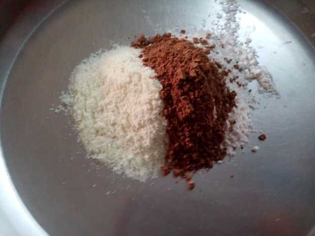 Mezclar la leche en polvo y cacao en polvo, batir bien para que se se mezcla uniformemente. En una sartén - añadir agua y azúcar, revolver bien para que se disuelva el azúcar completamente.