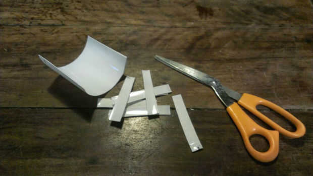 Cortar la parte superior e inferior fuera del contenedor. Luego cortar el cuerpo en tiras siendo tan precisa o tan casual como usted tiene gusto.