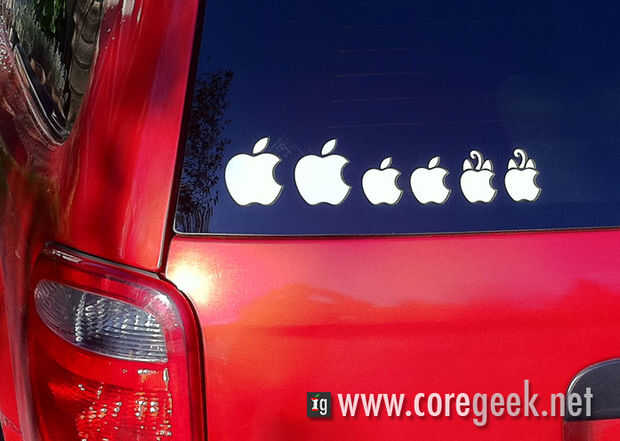 hace casi 2 años mi esposa mencionó que ella quería que algunos de esas "familia etiquetas engomadas" que se habían popularizado en familia transportistas (aka minivans). En ese tiempo el único tipo que había visto eran temáticas de Disneyland. Estamos bien con Disney pero quería algo que fuera nuestro sabor particular de familia. Luego un día me llamó la atención tenía varias pegatinas del logo de Apple en varios tamaños. El concepto era simple y con ligeras modificaciones incluido nuestros dos gatos.