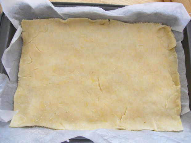 Rodillo plana otra masa y colocar en la bandeja cubriendo la mezcla de nuez