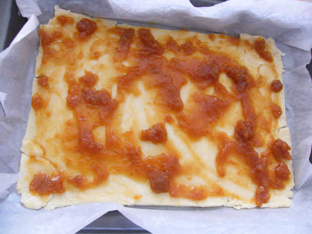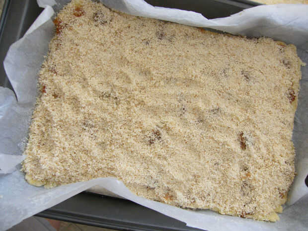 Extender la masa con mermelada otra vez luego espolvorear con la mezcla de nuez