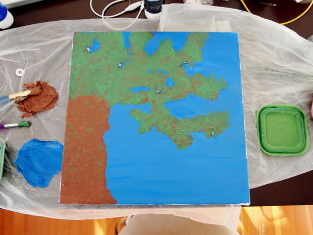 Ahora que las ramas se aplican, no hay que esperar para que se sequen. Empezar a ahora añadir verde y punto en sus hojas sobre las ramas y un poco sobre el tronco.