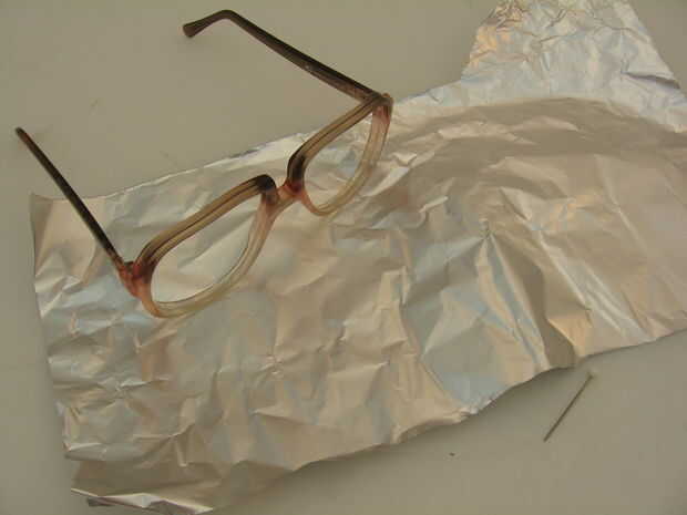 Para este proyecto, se necesita un marco de lentes viejos, papel de aluminio y un alfiler o aguja.