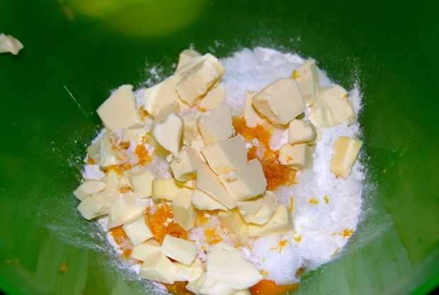 En un tazón mezcle la harina, las yemas de huevo, azúcar, mantequilla (cortada en trozos), la ralladura de naranja y el extracto de vainilla