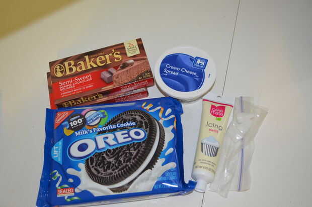 Paquete de galletas Oreo regular - un 15.5 (o 15.75 o algo) Queso crema - 6 oz, que es 3/4 de un paquete de 8 oz Blanco decorar glaseado Semi-Sweet Chocolate del panadero - 2 paquetes de 8 plazas cada una