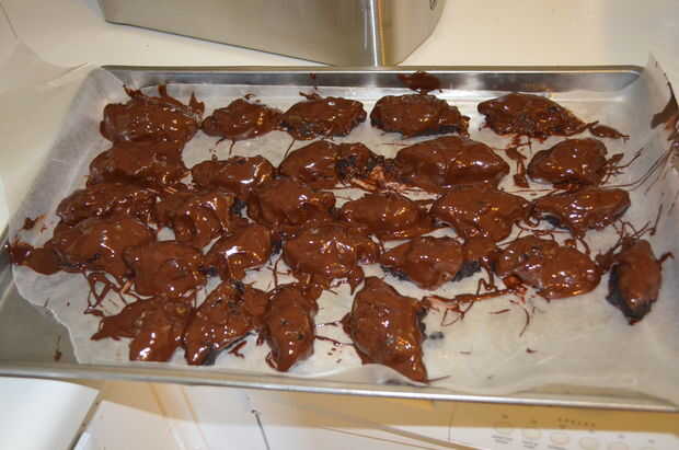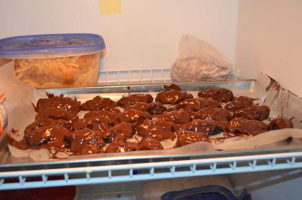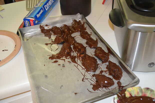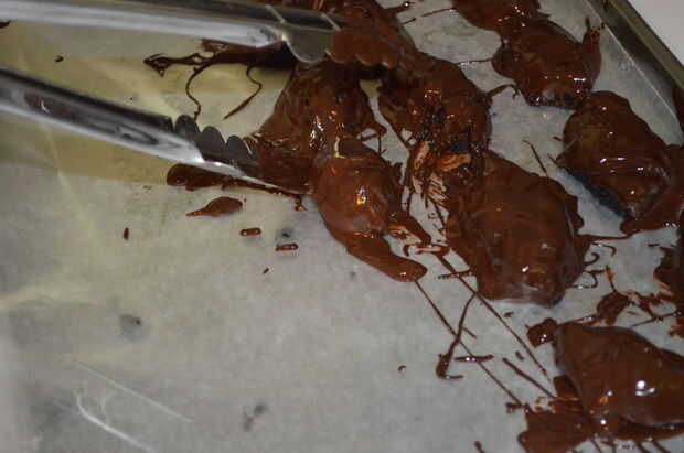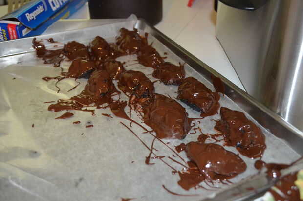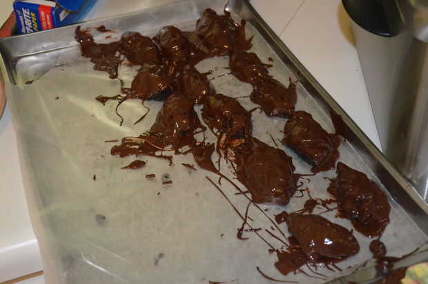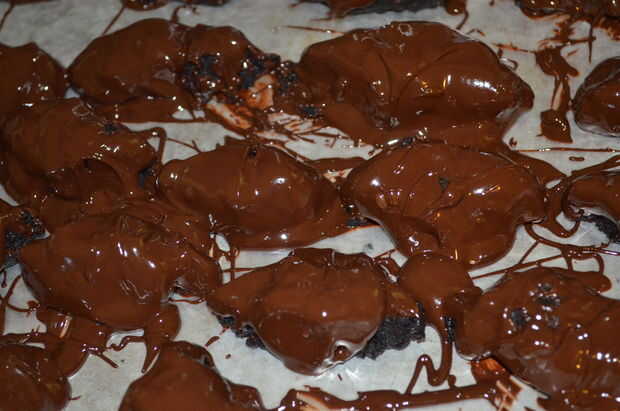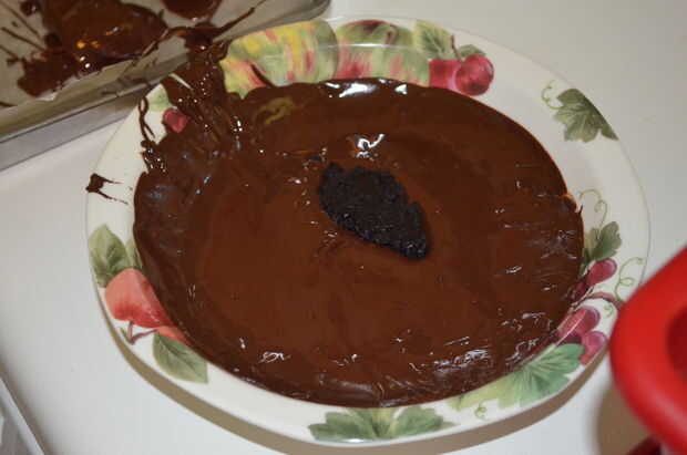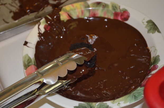 Antes de quitar los balones de oreo del congelador, derretir el chocolate de la panadería. Puesto 16 todas las piezas en un recipiente y cocinados en el microondas durante 2 minutos, retirar y revuelto, y ellos cocinados en el microondas durante 1 minuto más. Ahora los balones y transferir a un plato de papel, tazón de fuente o algo. Línea de la bandeja con papel de cera y conseguir el chocolate derretido. Tomar una pelota de fútbol y lo invertida en el chocolate dunk. Utilice tenazas para sacar el fútbol, dale la vuelta y ponerlo sobre la bandeja. Repita con los balones de fútbol. Poner de nuevo en el congelador durante 20 minutos.