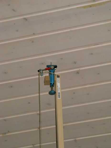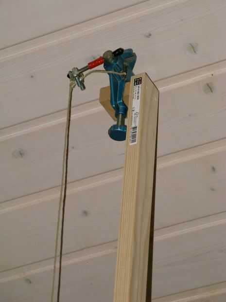 El gancho se llevó a cabo en las mordazas; el gancho fue atornillado en el techo (Afortunadamente hace de la madera) girando la barra de madera de debajo; el gancho fue liberado finalmente por medio de una cuerda anudada al nivel del tornillo de banco: Tire de la cuerda llevaría las mordazas para abrir.