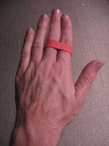 Este truco consiste en todos los dedos de la mano excepto el pulgar. Envuelve una banda elástica alrededor de los dedos o dos a la izquierda o la derecha. No importa que, siempre y cuando la goma no está en sus mediados dos dedos.
