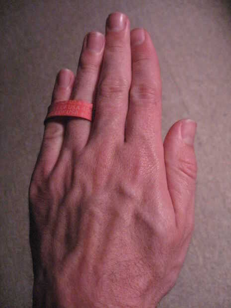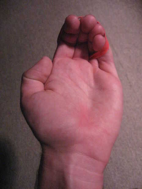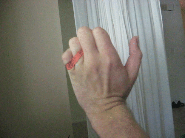 Una vez la instalación acabada, levantar la mano con el dorso hacia el público. Tan rápido como puede, ampliar los cuatro dedos hacia arriba, y aparecerá como si la goma por arte de magia salta del dedo a dedo.