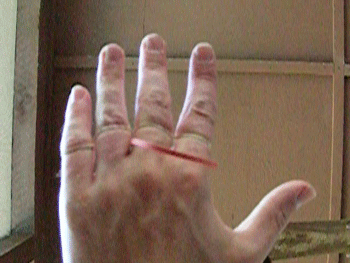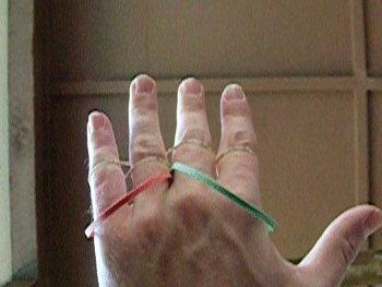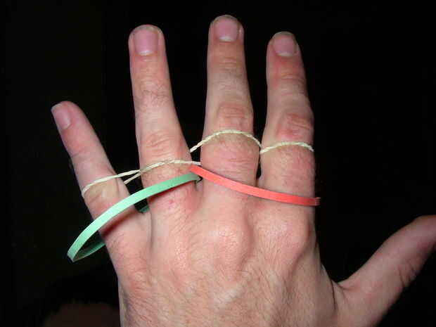 Para el toque final, girar una tercera banda de goma alrededor de cada uno de los cuatro dedos. Funciona mejor si la goma está por debajo del nudillo más bajo. Así, la banda de goma es siempre en vista, hacen un puño. Explicar a la audiencia cómo las gomas quedan atrapadas por debajo de esta banda de goma y cómo no es posible que podrían dejar los dedos que están en. Vaya a proceder con el truco como se describió anteriormente y básicamente ignorar la tercer banda de goma. Debería funcionar exactamente igual.
