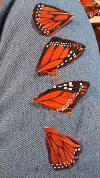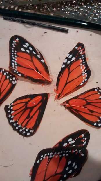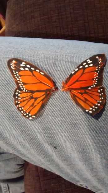 Tomó las alas de la mariposa del cuerpo (al igual que cualquier niño morboso haría, me refiero a serio, hada muerta!) y separar las partes. He pintado a un lado por lo que sería un dolor para meterse un cepillo en la parte pequeña de la caja torácica. Solo hice una capa porque me gustó cómo sangraba el patrón original a través de un poco más.