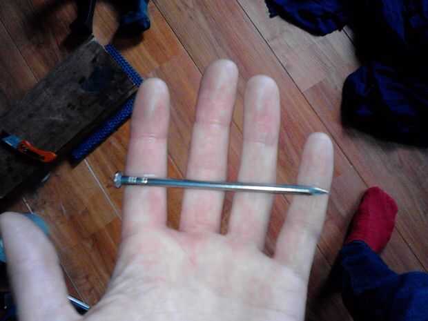 Tuerca, arandelas y el perno (mismo diámetro como el clavo, 4mm para mí)