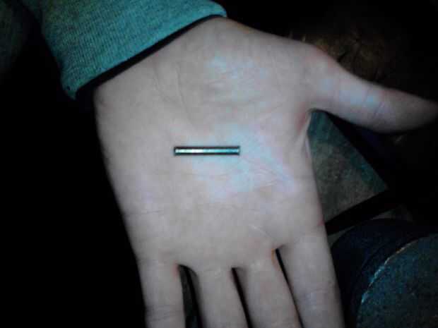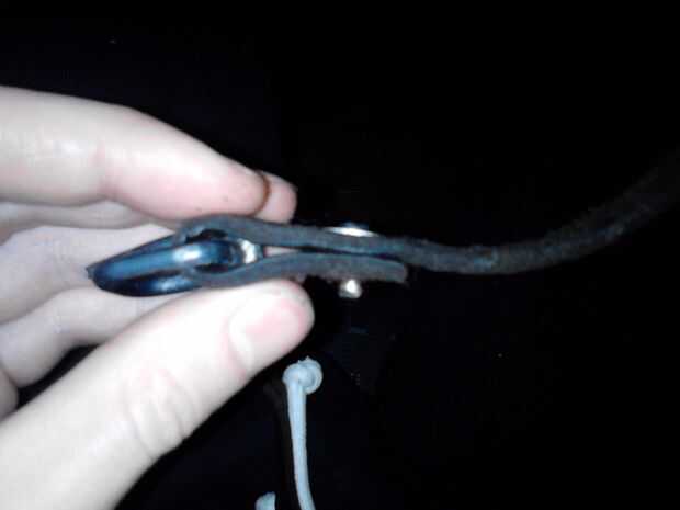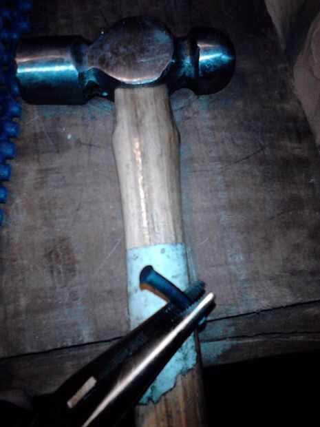 Para finalizar todo lo que necesitamos hacer es remache de correa de cuero que yo así que la hebilla es segura, por lo que vas a necesitar un remache. Utilizar el resto de su segundo clavo, un pequeño martillo y el yunque, comenzar por martilleando el final así que setas en un remache. Corte el remache con su boltcutters pero asegúrese de que su lo suficientemente grande para caber a través de dos capas de cuero y dos arandelas.
