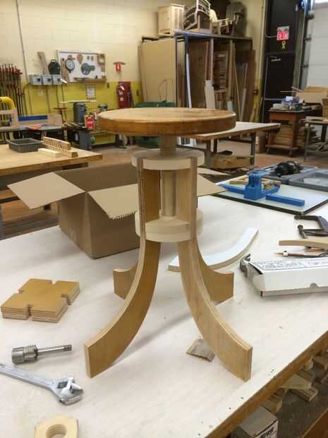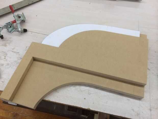 Como siempre, modeló el taburete en RHINO 3d. El diseño de la pierna pasó por diversas variaciones hasta que llegué apenas a la derecha. También pude hacer una plantilla de recorte al ras decente para hacer el proceso más seguro. Estoy todavía en el proceso de tratar de averiguar la mejor manera de proteger el proceso de recorte al ras. Nuevas regulaciones se han puesto en lugar en nuestro tablero, y usando una plantilla como esta tendrá algunos aprobación en el futuro.